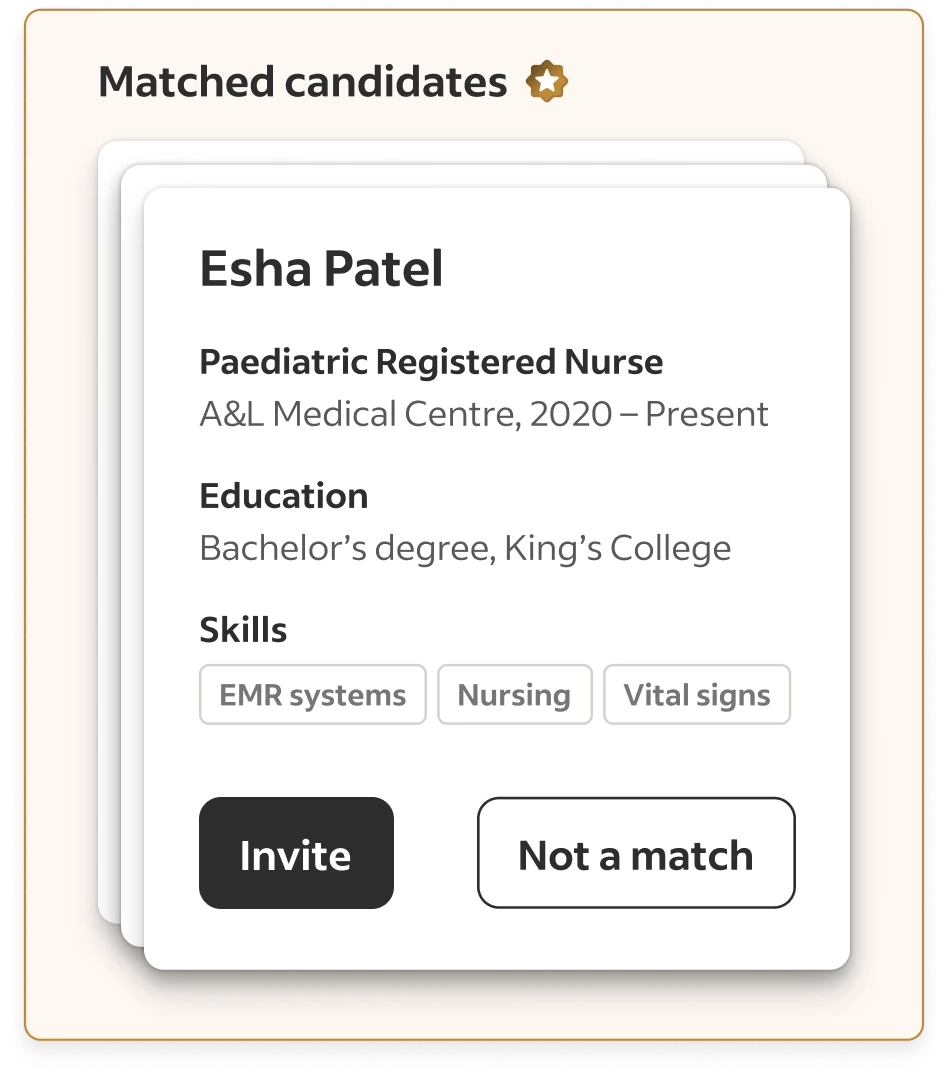Instantly match with quality candidates who fit your job criteria based on information collected from the jobseeker and invite them to apply. Autogenerated candidate highlights help create a personal touch to your outreach.